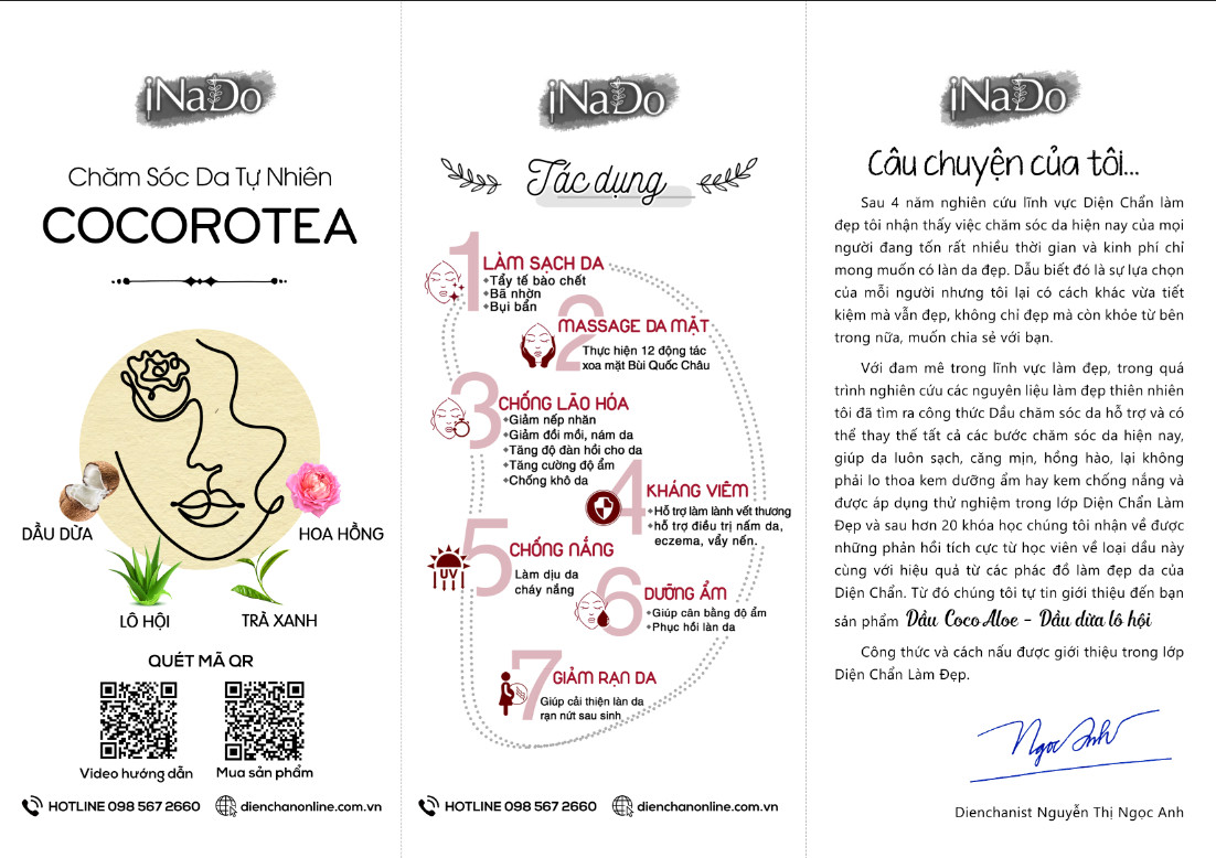 Trong quá trình giảng dạy và nghiên cứu các sản phẩm thiên nhiên và làm đẹp cô Ngọc Anh đã đưa các công thức và cách làm Dầu dừa lô hội vào làm đẹp. Sau một thời gian áp dụng trên 20 khóa học iNaDo đã đúc rút được ra các công thức hoàn hảo và các phác đồ cho việc làm sạch, dưỡng da và chăm sóc da. Chúng tôi đã cho thử nghiệm và nhận phản hồi từ học viên khắp nơi, để hôm nay giới thiệu đến các bạn công thức Dầu Chăm sóc da hoàn hảo CocoRotea