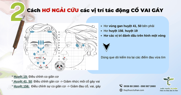 Ta tiếp tục làm 3 bước Chấm dầu, dò điểm đau -> Tác động day ấn -> Hơ ngải vào các vị trị đồng ứng Cổ Gáy Vai gồm: