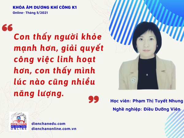 Từ khi biết chữa bệnh theo Diện Chẩn, biết đến Âm Dương Khí Công con luôn tâm niệm câu nói của Thầy “Tâm Bình-Trí Sáng". Con thấy người khỏe mạnh hơn, giải quyết công việc linh hoạt hơn, con thấy mình lúc nào cũng nhiều năng lượng.