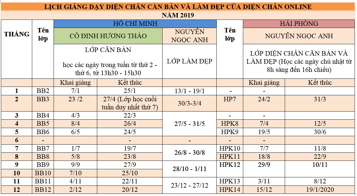 Văn Phòng Diện Chẩn Online tại Hải Phòng và Thành Phố Hồ Chí Minh thông báo lịch giảng dạy Lớp Diện Chẩn Căn Bản và làm đẹp năm 2019: